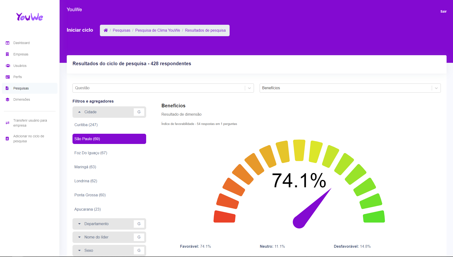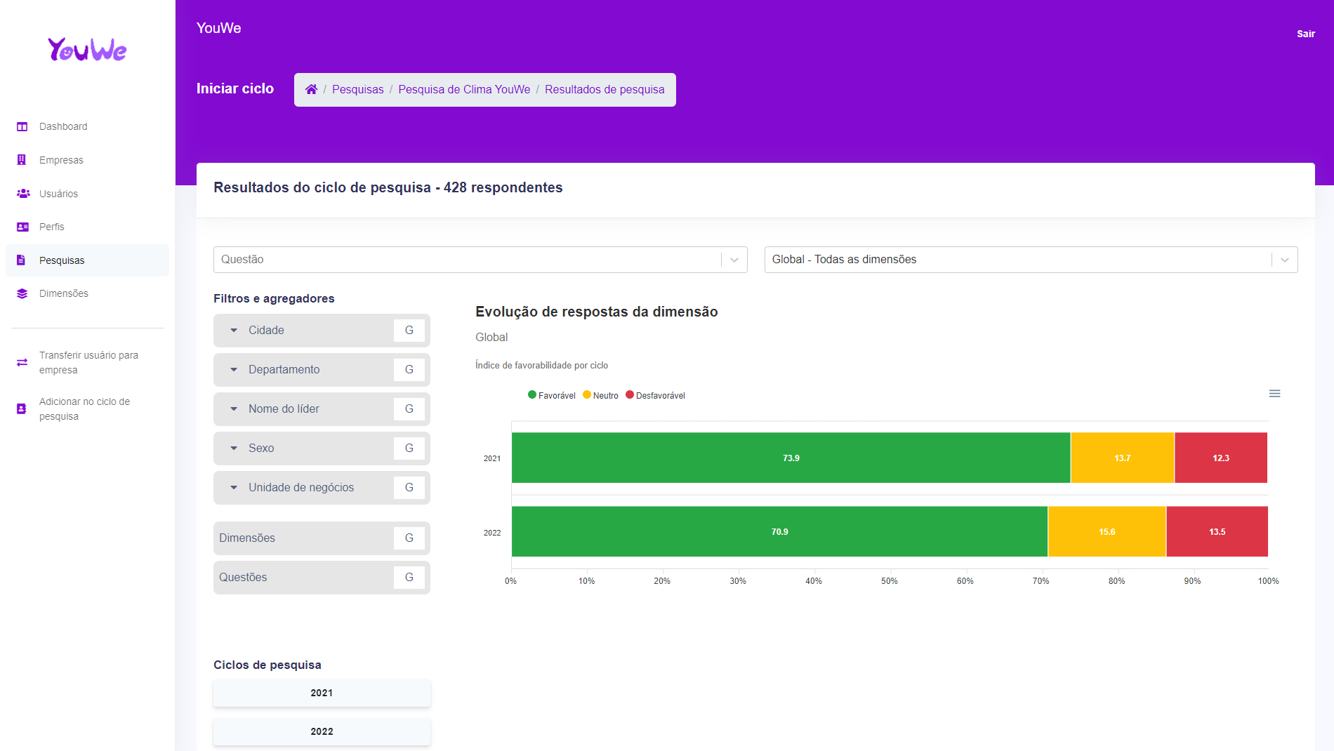 Visualize os resultados por: liderança, empresa, cidade, unidade … pelo o que desejar!